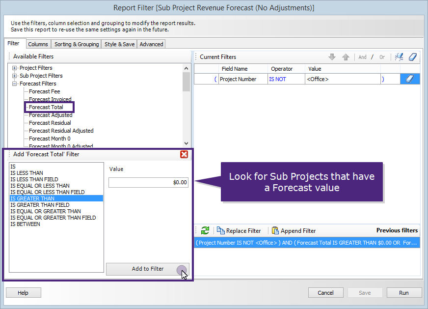 Forecast financial filters are available for use in Project and Sub Project level forecasting reports. These filters allow you to search your data for forecast values that fall within a selected revenue value range, or where the value greater than, less than, equal to a chosen value. Filters can be applied for forecast values like fees, invoiced values, forecast totals, and forecast monthly values. Forecast filters can also been used to compare two different forecast financial field values. For example compare the forecast residual fee against the invoiced value for the sub project.