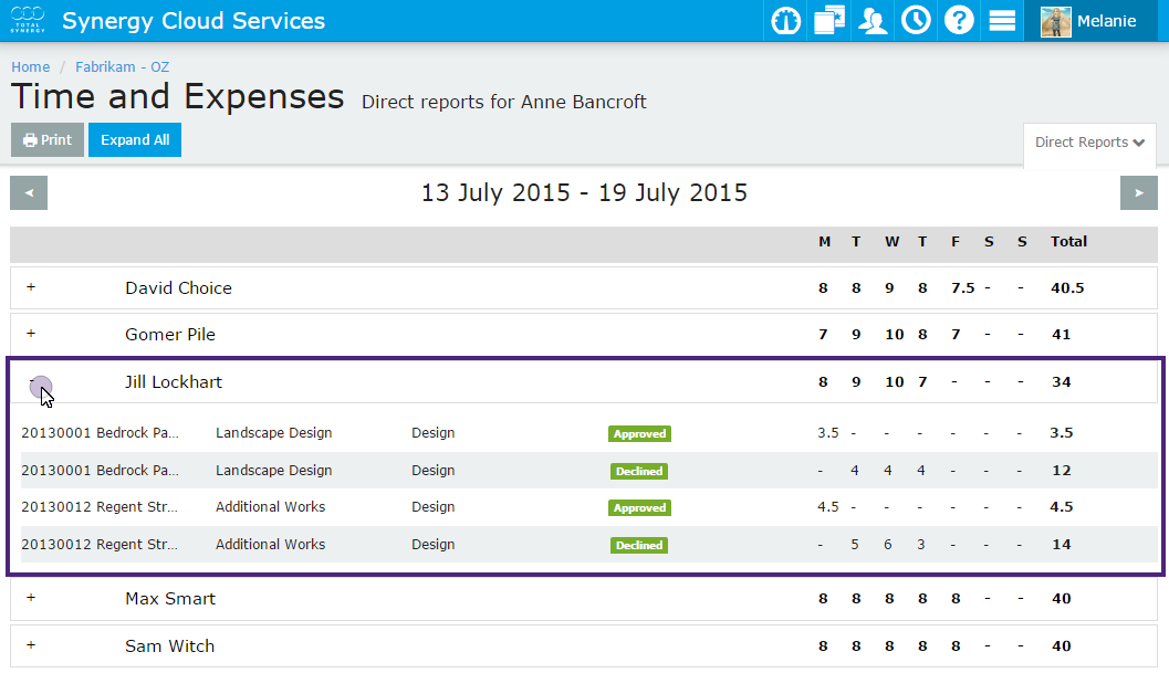 Expand a staff member group using the '+' on the row to see the summary details of the entered timesheets in that week. Or if you want to see all the staff members timesheet details then click the 'Expand All' button in the top toolbar.